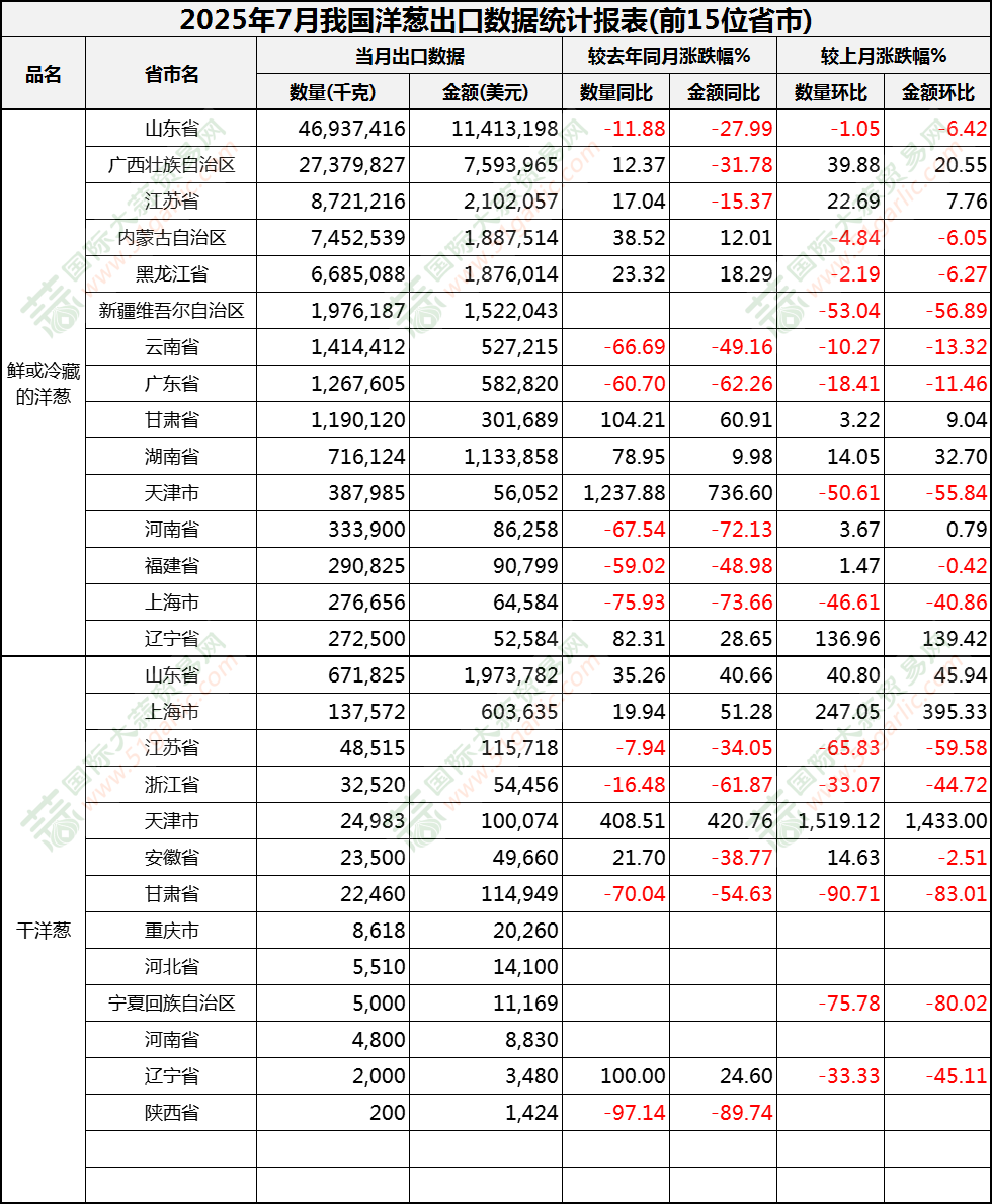 2025年7月洋蔥出口數(shù)據(jù)(按省市)