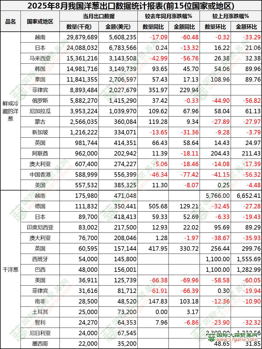 2025年8月洋蔥出口數(shù)據(jù)(按國家)