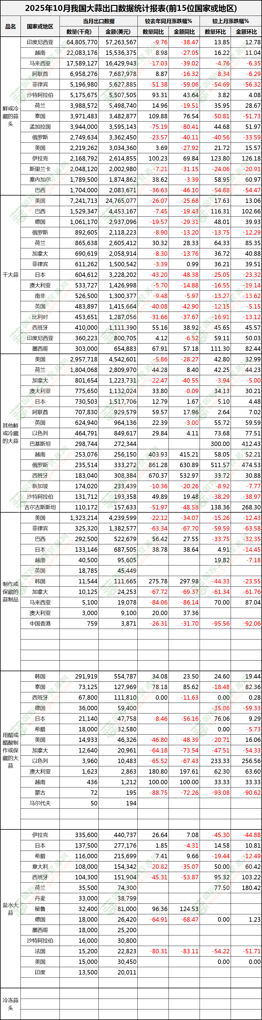 2025年10月大蒜出口數(shù)據(jù)(按國(guó)家)