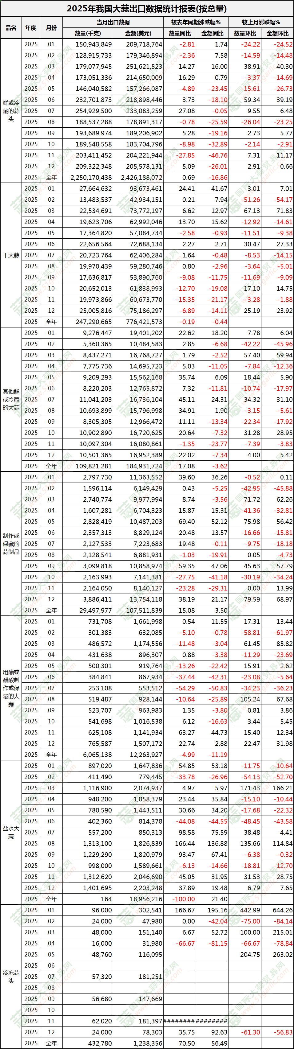 2025年全年大蒜出口數(shù)據(jù)(按總量)