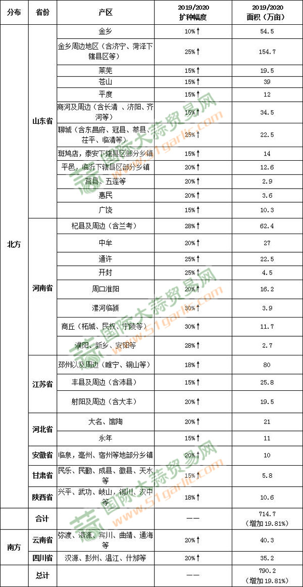 2019-2020年度全國大蒜種植面積統(tǒng)計(jì)