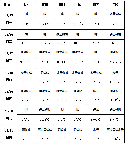 未來一周(12.15-12.21)大蒜主產(chǎn)區(qū)(金鄉(xiāng)、邳州等)天氣以晴或晴轉(zhuǎn)多云為主,僅 12.21 邳州、蘭陵可能出現(xiàn)雨夾雪天氣。與上周相比,周內(nèi)氣溫開啟大規(guī)?;嘏J剑芪逯皻鉁刂鸩交厣?,周內(nèi)金鄉(xiāng)最高 17℃,周六之后,產(chǎn)區(qū)氣溫再度回落,金鄉(xiāng)最低溫達(dá)- 5℃。降水方面僅周末局部產(chǎn)區(qū)將出現(xiàn)雨夾雪,整體降水稀少。